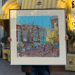 The Japanese cherry trees in the Choorstraat are in full bloom. It will only last a week or so. Mark has yielded to the attraction and has installed himself halfway down the Choorstraat, where it joins the Papenstraat. He is seated across the street from bakery “The Diamond Ring” and draws the white blossom on the trees in all its glory. This is a busy spot in the old town. Many of the passers-by take a peek at Mark’s drawing and offer compliments, ask for a business card, or take pride in telling Mark that they already have a ‘Huystee’ at home: ‘Over the sofa.’ That will be one of Mark’s townscapes, but this time he has opted for a slightly more modest variant. He decided to focus on the trees and set his format to 80 by 60 centimetres, but before long he had to tape on an extra strip of paper to make room for the bakery. ‘Oh well, I became a bit more ambitious.’
